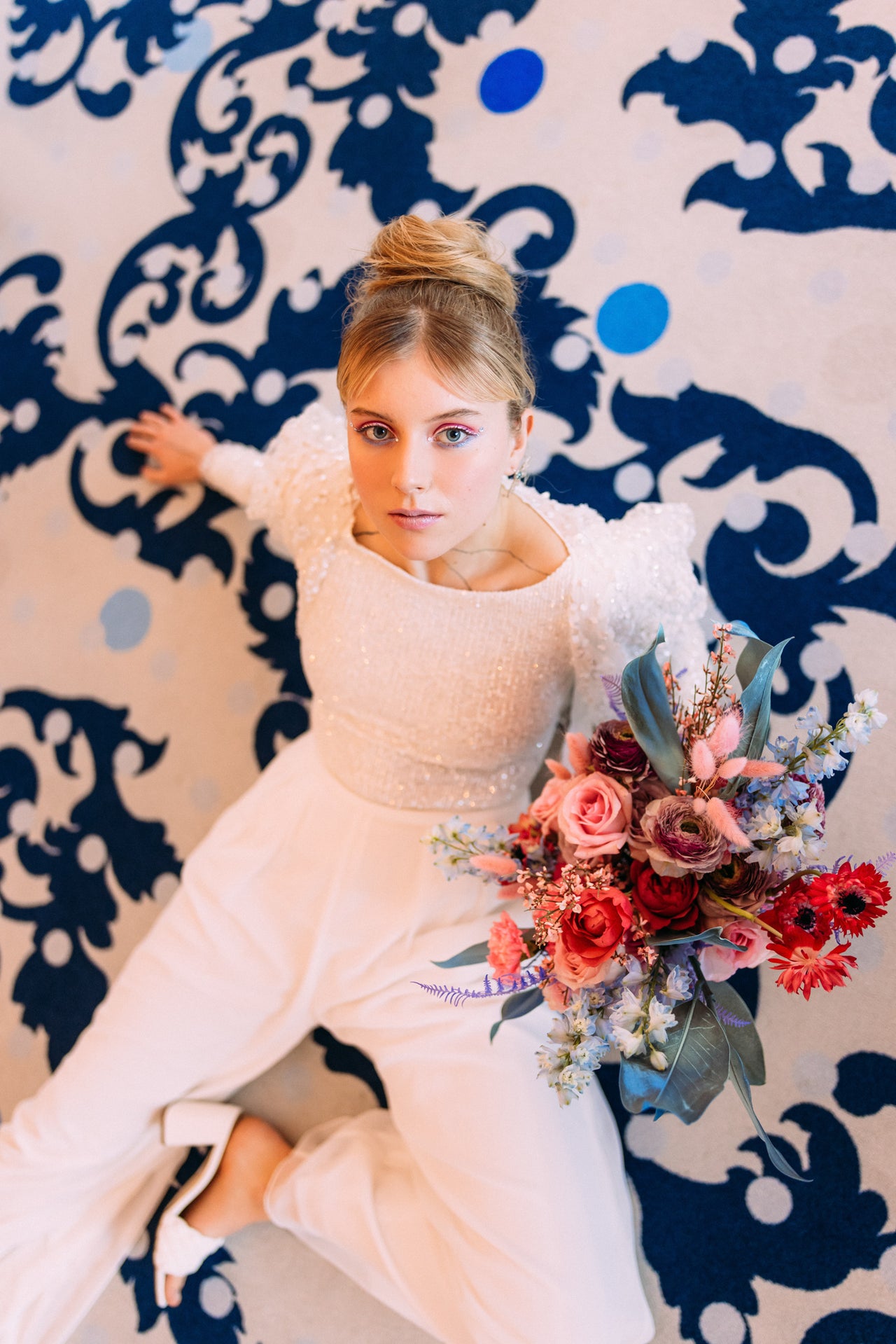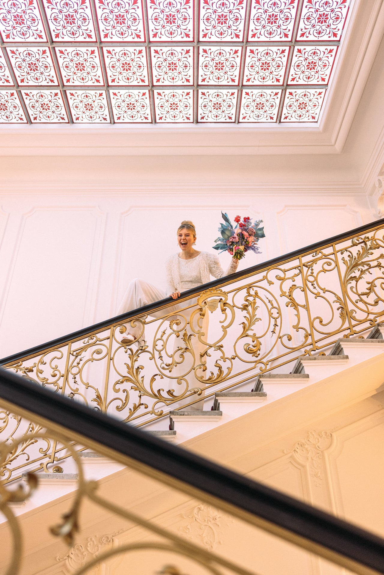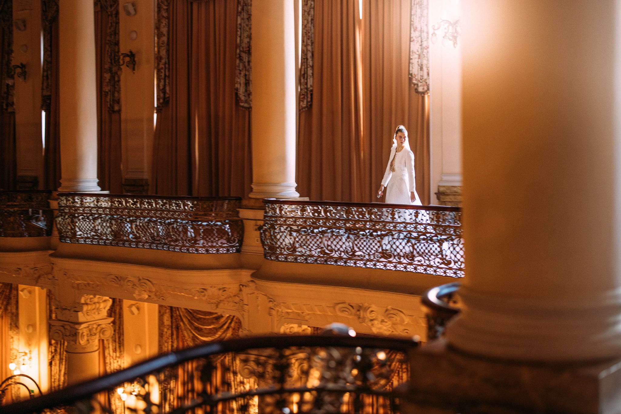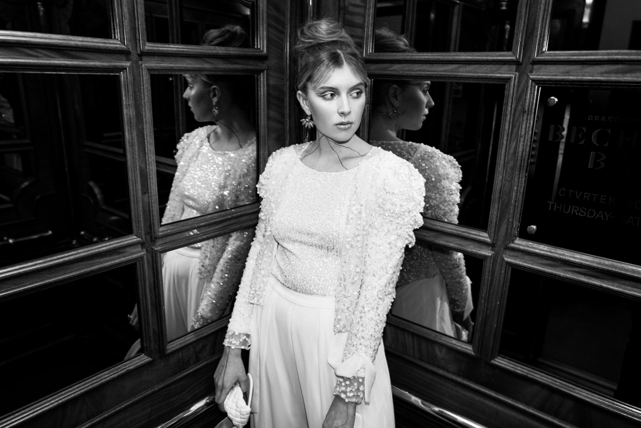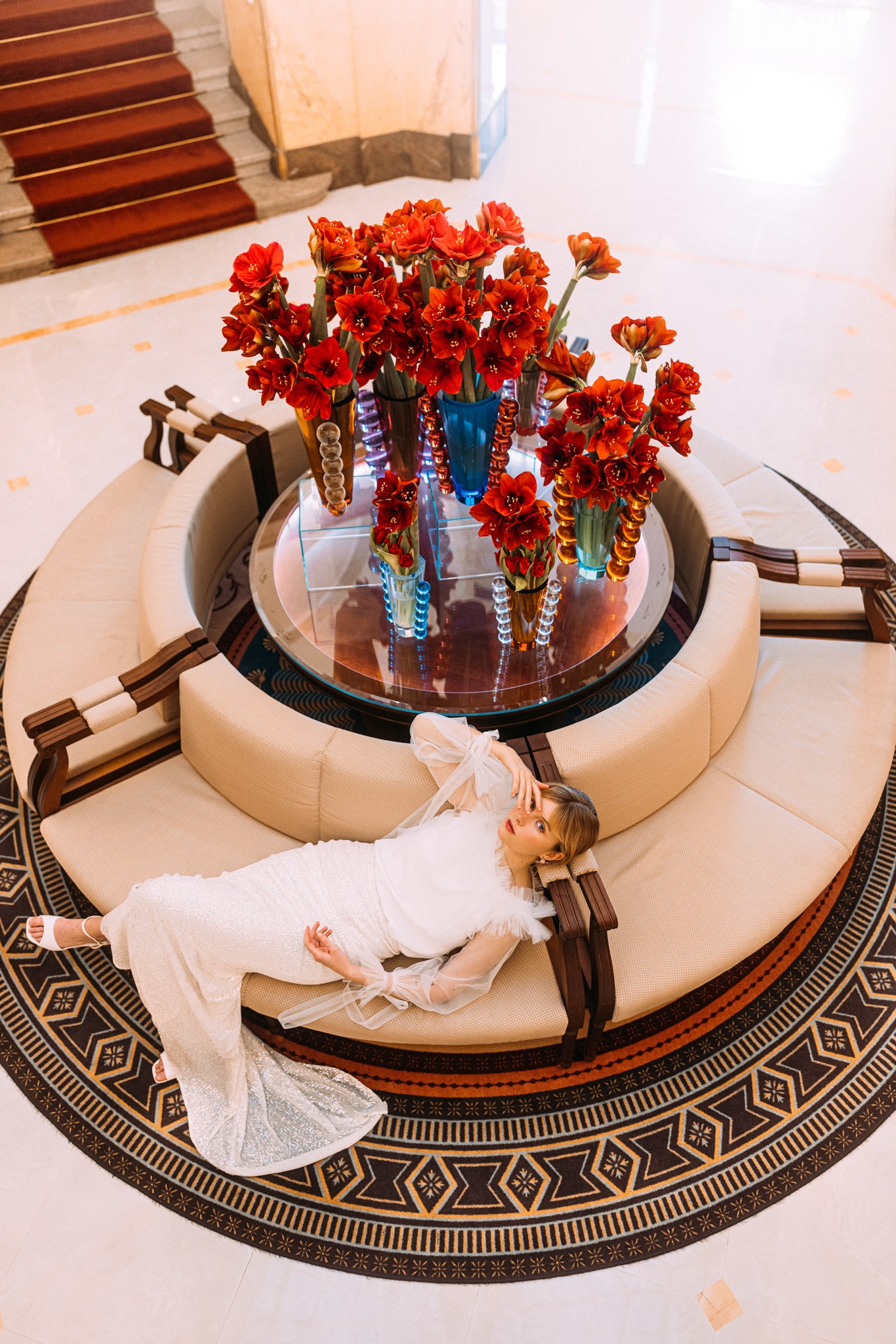 To see all 228 rooms of the lavish hotel, the bride would have missed her own wedding. She hurries only where her feet take her, to the light from the high windows and the crystal chandeliers. Here she stops by an ornate lamp resembling a cluster of beautiful berries, twirls to the rhythm of the music in the ballroom and theatre, and, if she feels like it, lays her head on the carpet. Behind her pink eyelids, she dreams of who knows what, perhaps of her chosen one, perhaps of a wedding bouquet with blue leaves, perhaps of a ring in the shape of a flower created by the magical jewellery designer Janja.