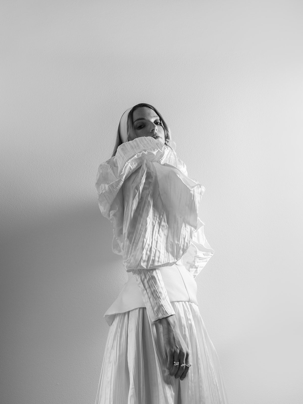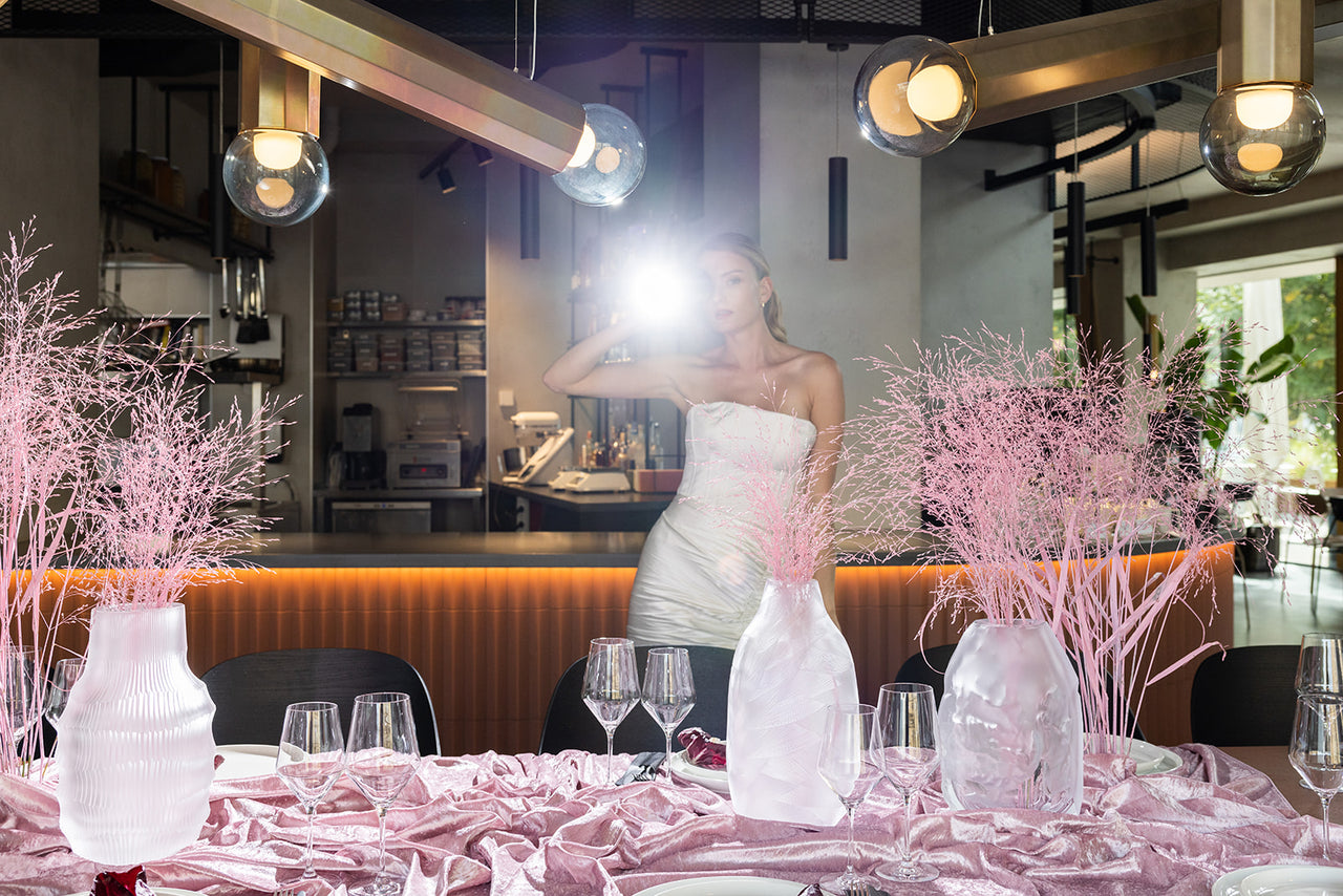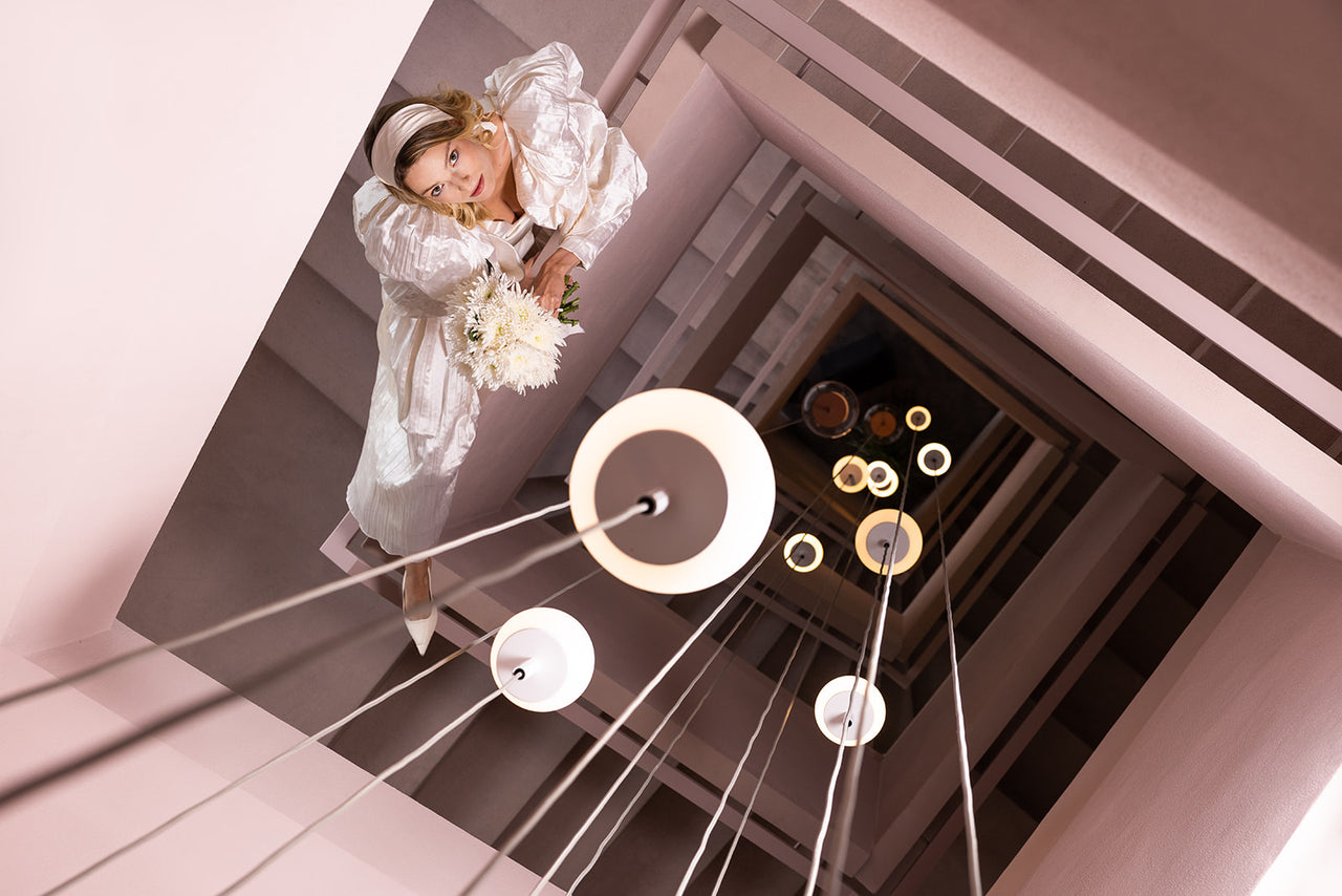 In the beginning, there was romance with puffy sleeves. A prim bride ready to go to her wedding reception. But then, right on the hotel pre-mises, the sweet-as-pie bride began to metamorphose into a vamp. It was as through three different women had come together, each with her own dream of the perfect wedding. One was fascinated by a stylish staircase illuminated by endless streams of light and leading to a terrace overlooking the Jeseníky Mountains. The second, in the hotel’s restaurant with its renowned cuisine, didn’t think twice about biting into the cake without waiting for the groom. And the third took her fate into her own hands and ran out into the big world outside the hotel door.