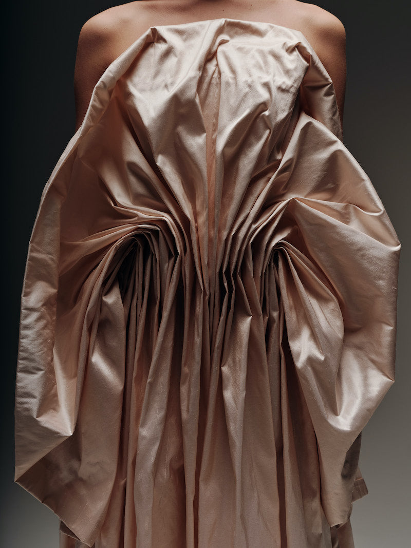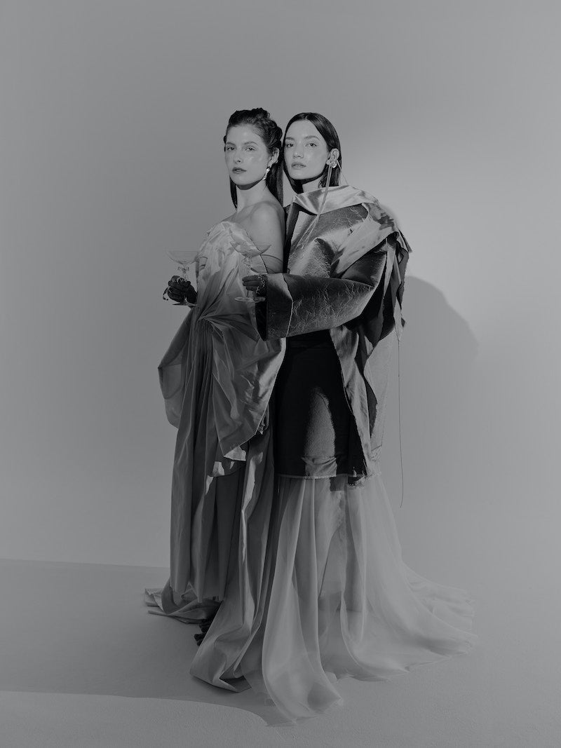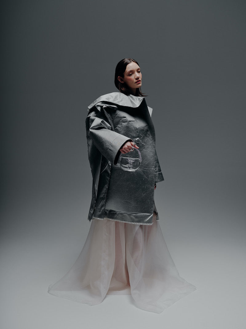 Both bridal outfits have almost architectural qualities, with unsuspected details standing out in the play of light and shadow. An oversized silver jacket paired with a delicate skirt evokes confident elegance and strength. When designing it, Šárka Zejdová had in mind the well-known saying about what a bride should wear on her wedding day, but more important than whether something is borrowed or blue is connecting the past with the future and new beginnings. For her wedding dress design, Klára Drevenák took inspiration from Degas’ famous paintings of young ballerinas. Their fragility and innocence remain, but the girl has grown into a woman. And the dancers’ flowing skirts are replaced by sophisticated tailoring.